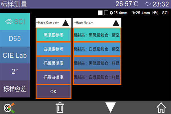 4、根据雾度测量的控件提示,执行相应的操作,四步操作的数据均测量完成后,字体颜色变绿,最后点击“OK”即完成本次雾度测量,雾度数据也会显示在颜色指数界面中。