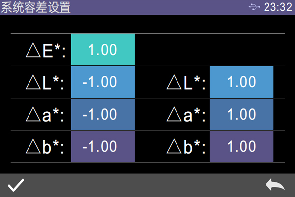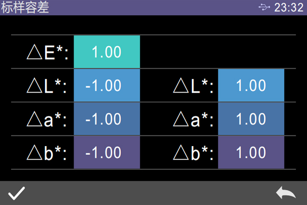 ΔE*为设置标样总容差(CIE1976);左侧ΔL*为设置标样容差下限,右侧ΔL*为设置标样容差上限,右侧容差上限一定要大于容差下限;Δa*、Δb*设置方法同于ΔL*。点击对应的容差数值,进入相应的数值设置界面,设置完毕点击“√”确认保存,即以此容差为标准;若点击下侧“←”取消并退出容差设置界面。